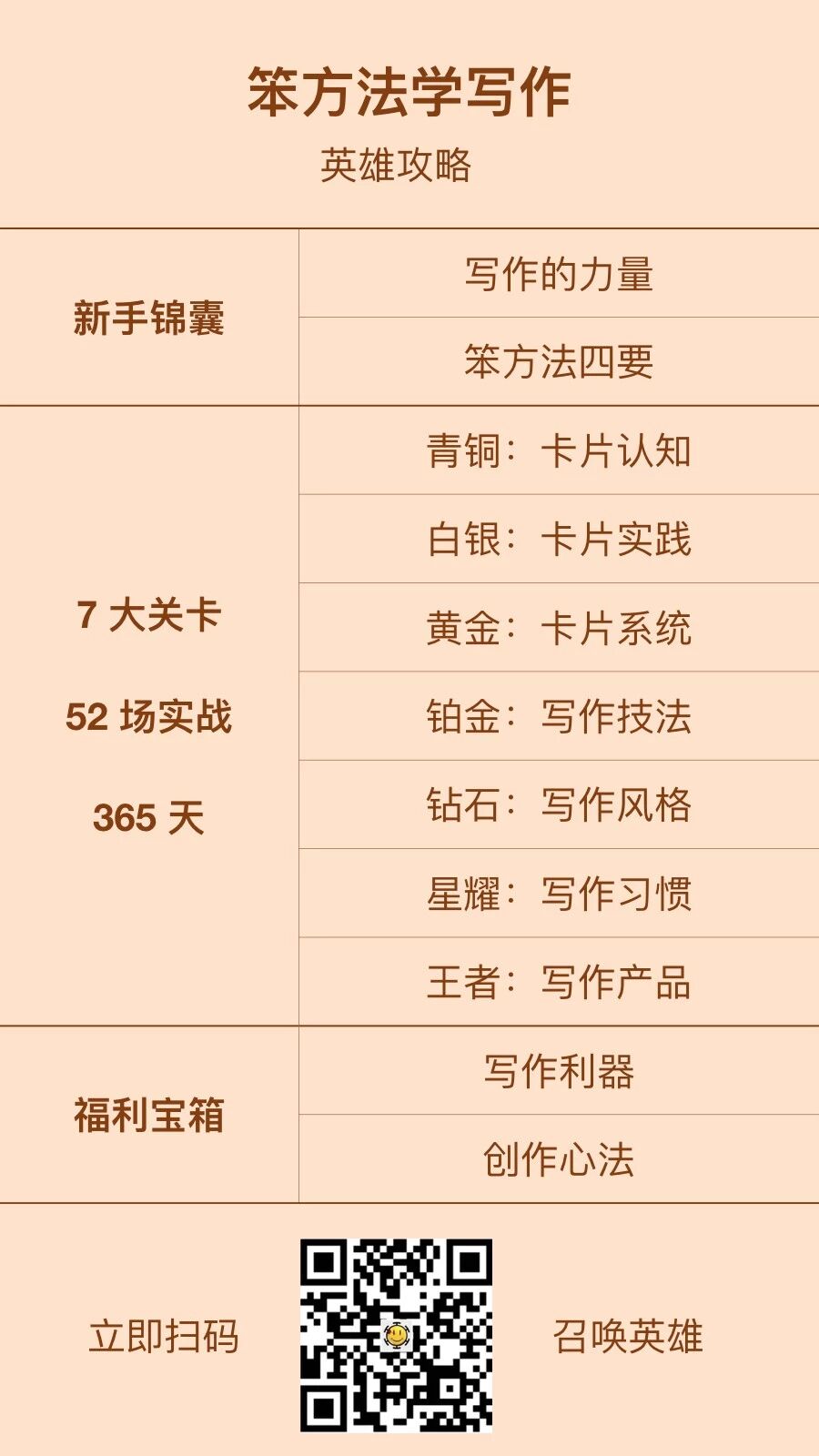 历经 8 个月升级,新版「笨方法学写作」课程已在知识星球上线,卡片写作模块,从原来的 15 讲升级至 30 讲(实际内容可能超过 30 讲),将卡片写作分为三个小节 1)卡片认知;2)卡片实践;3)卡片系统,设计更科学、内容更翔实、细节更丰富、实践更具体。
